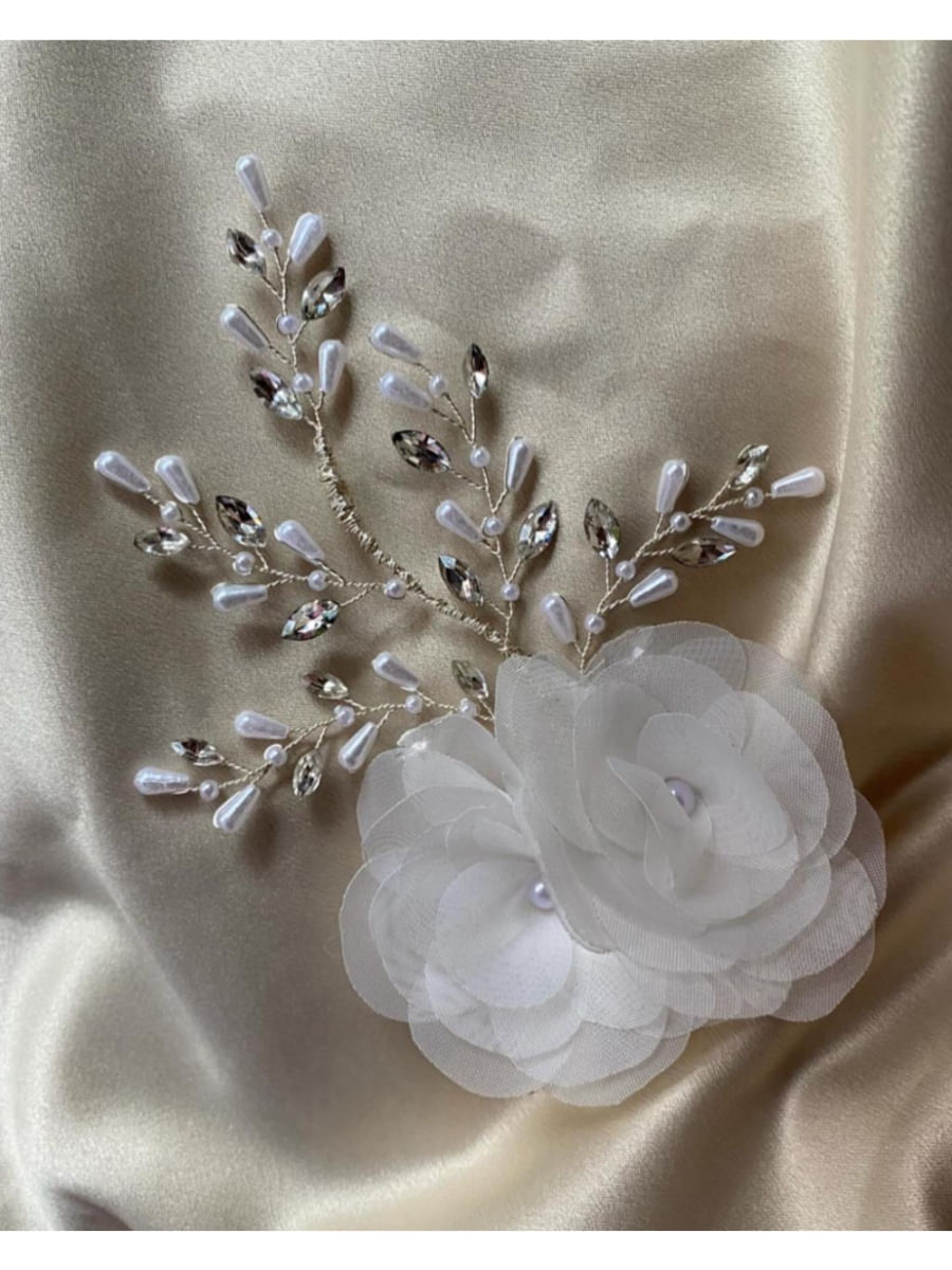 Presilha de Rosas com Navetes – Delicadeza para Penteados LateraisPresilha charmosa com rosas em tecido e detalhes em navetes, perfeita para compor penteados laterais com romantismo e sofisticação. Um toque floral que valoriza o visual da noiva com leveza e brilho na medida certa.